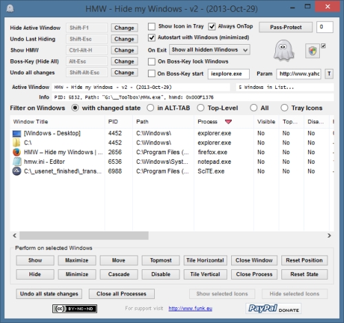 HMW is a free program to hide away the Windows on your desktop. With HMW you can set any program Window as hidden, while the program itself will run silently in the background. Additionally all the Hotkeys used can be customized to your needs.