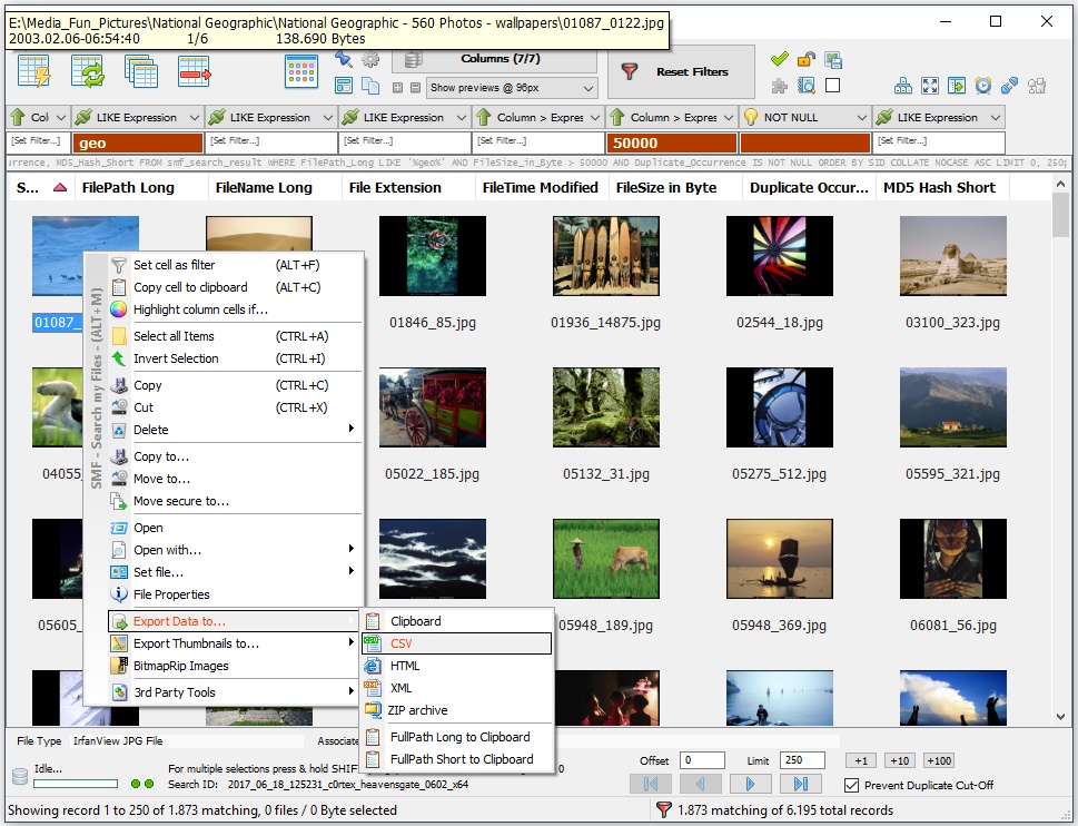 - Search for pictures of a certain filesize / dimension / EXIF info